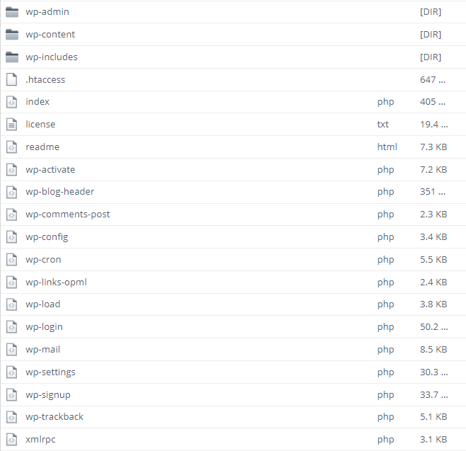 - Заходим в корень. Это основная директория, в ней будут папки /wp-admin/, /wp-content/, /wp-includes/ и прочие файлы.